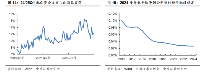根据中国证券业协会的统计,2024年行业共实现代理买卖证券业务净收入(含交易单元席位租赁)1151.49亿元。由此计算,将北向资金成交占比按2024年月加权平均值13.83%的比例剔除后,2024年行业平均净佣金率为0.2596‰(万分之2.596),同比-1.3%,暂时趋于相对稳定。