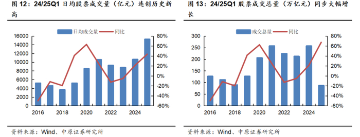 2025Q1全市场日均股票成交量为15248亿元,较2024年全年进一步增长43.54%,同比+70.25%;成交总量为86.92万亿元,同比+67.31%。25Q1全市场日均股票成交量再创历史新高,且增幅较2024年进一步明显扩大。