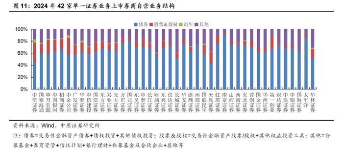 根据各公司合并财务报表,截至2024年底,42家单一证券业务上市券商泛自营业务中,债券、股票/股权、衍生、其他合计占比分别为60.95%、17.65%、1.94%、19.46%,同比分别+2.80pct、-0.82pct、-0.08pct、-1.90pct。共40家上市券商固定收益类金融资产在泛自营资产配置中的比例超过50%,同比+5家,仅中信证券(40.02%)、中金公司(42.99%)固收资产配置比例在50%以下;共3家上市券商固收金融资产占比超过80%,同比-6家,分别为国元证券(80.98%)、太平洋(84.92%)、南京证券(90.72%)。整体看,上市券商泛自营资产配置持续以债券等固定收益类金融资产为主,并且截至2024年底固收资产配置比例同比进一步提升。32家中小券商的固收资产算术平均配置比例为68.39%,高于前10位头部券商的53.22%,主要由于一是中小券商的收入来源相对单薄,近年来对权益方向性自营业务的开展普遍趋于谨慎;二是中小券商权益类中性业务的规模与头部券商相比存在较大差距。