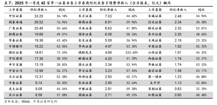 25Q1上市券商合并口径经纪业务手续费净收入增幅前5位分别为国联民生(333.69%,主因为并表民生证券)、国泰海通(76.96%)、国信证券(72.54%)、中银证券(59.28%)、国金证券(58.26%)。共19家公司的同比表现优于上市券商平均值,占比45.2%,部分机构经纪业务相对弱势、零售经纪业务占据主导的上市券商增幅靠前,零售经纪业务仍贡献了2025年一季度经纪业务手续费净收入的主要增量。