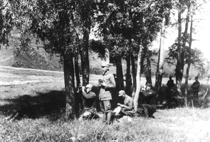 1937年秋,平型关战斗胜利后,毛主席指示八路军115师提供平型关战斗素材,供国内和国际进行反法西斯宣传。照片中,从左至右分别为郭天民、聂荣臻、孙毅、许建国。沙飞摄