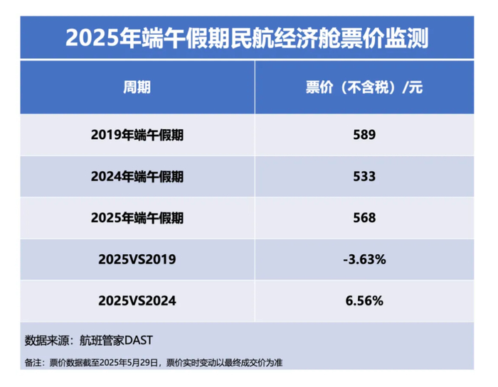 票价方面,据航班管家数据显示,截至5月29日,2025年端午假期国内经济舱平均票价(不含税)589元,同比增长6.56%,较2019年下降3.63%。