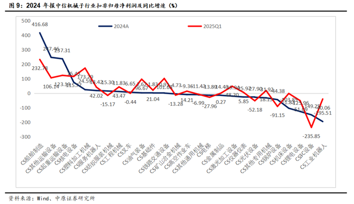 2025Q1子行业里增速较快的主要有船舶制造(+232.78%)、起重运输设备(+123.19%)、核电设备(+115.77%)、其他运输设备(+106.14%)、铁路交通设备(101.68%)增速位居前列,增速超100%,3C设备、锅炉设备、光伏设备、锂电设备、工业机器人排名靠后,均为负增长40%以上。