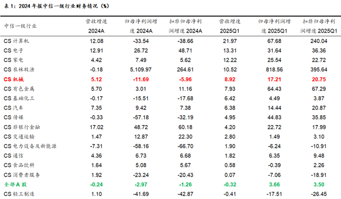 1.1. 中信机械行业2024年报增收不增利,2025Q1业绩明显增长