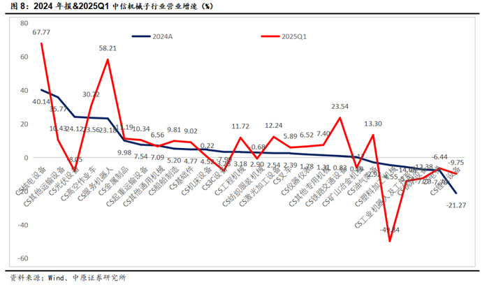 2025Q1子行业里增速较快的主要有核电设备(67.77%)、服务机器人(58.21%)、高空作业车(30.72%)、铁路交通设备(23.54%)、油气设备(13.33%),塑料加工机械、工业机器人、锅炉设备等行业表现较差。