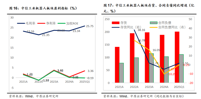 2024年报中信工业机器人及工控系统板块实现营业收入419.49亿,同比下滑5.73%,实现扣非归母净利润-5.92亿,同比赢转亏。2025Q1板块营业收入83.88亿,同比下滑14.08%,扣非归母净利润同比下滑40.06%。2024年工业机器人产量已经实现了转正增长,但企业营业收入和净利润并没有明显好转,财务情况呈下滑态势,盈利能力较弱。
