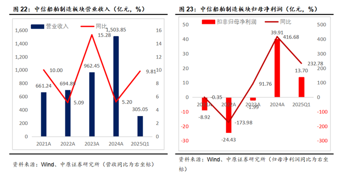 2024年报中信船舶制造板块实现营业收入1503.85亿,同比增长5.2%,实现扣非归母净利润39.91亿,同比增长416.68%。