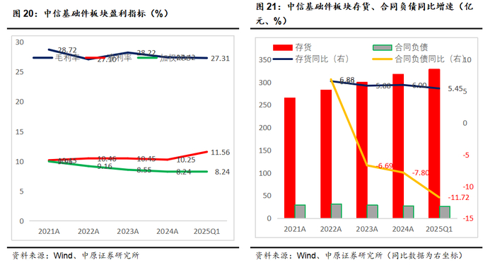 中信基础价板块毛利率比较平稳,小幅下跌,但净利率呈现稳步上行的趋势。中信基础件板块存货、合同负债增速小幅下行。