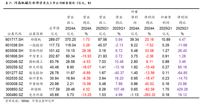 从财报上看,思维列控、开普检测2024年报、2025Q1均实现了较高的增长,矿山冶金机械、农业机械板块的郑煤机、中信重工、一拖股份等龙头企业财报相对稳健,郑煤机2024年实现了归母净利润增长20%。新强联2025Q1业绩有明显的反弹,单季度归母净利润增长429.28%。