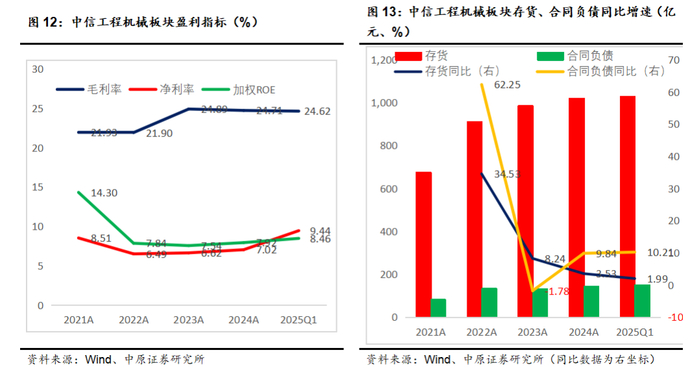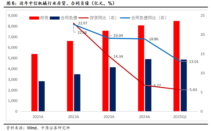 2025Q1中信机械行业存货、合同负债增速分别为5.63%、13.01%,保持了稳健增长,但增速继续放缓。