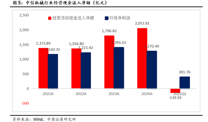 2025Q1中信机械行业经营现金流入净额为-139.92亿元,低于归母净利润情况,表明一季度行业回款有波动。