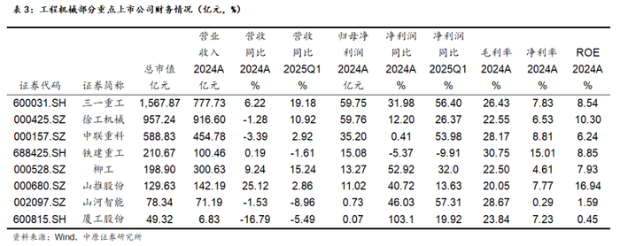 重点子公司财报:2024年报工程机械上市公司营业收入相对比较平淡,但归母净利润普遍取得良好的增速,2025Q1更是普遍实现归母净利润高增长。反应了行业复苏,企业盈利能力有明显的修复。龙头三一重工、徐工机械均取得较好的业绩增长。
