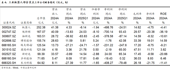 重点子公司财报:2024年报中信工业机器人及工控系统上市公司财报表现较差,出现较多亏损的情况,包括龙头公司埃斯顿、机器人都出现了亏损。2025Q1行业经营情况有一定程度改善,大部分企业净利润出现两位数的同比增长。