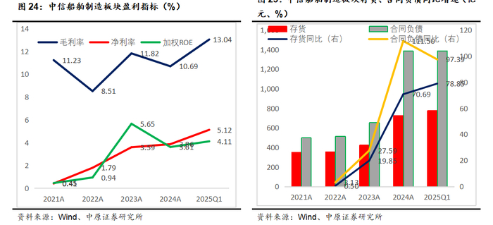 2025Q1中信船舶制造板块毛利率大幅提升到13.04%,同比2024年报增长2.35个百分点,净利率持续提升到5.12%。反应了随着高价船舶订单进入交付,船舶制造企业盈利能力有明显提升。船舶制造板块存货、合同负债增速都超过70%,反应了行业需求情况非常好。