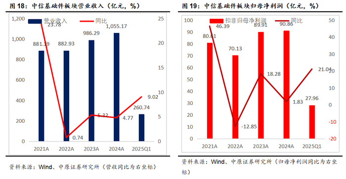 2024年报中信基础件板块实现营业收入1055.17亿,同比增长4.77%,实现扣非归母净利润90.86亿,同比增长1.83%。