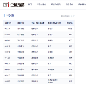 截至2025年5月27日,中证指数官网数据显示,该指数前十大权重股包括北方华创、中芯国际、海光信息、中科曙光、中微公司等,前十大权重股合计占比达58.39%。(注:文中个股仅作示例,不构成实际投资建议。基金有风险,投资需谨慎。)