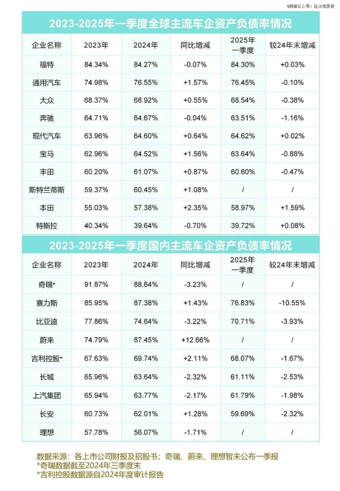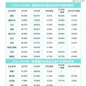 资产负债率是用来衡量上市公司运营健康状况的常用指标之一。从2024年和2025年一季度财报来看,高负债是汽车产业的典型特征。这是否说明汽车行业已经存在较大的风险?
