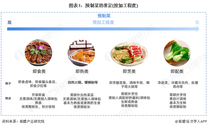 预制菜可根据预加工程度、菜肴后续处理、调味与否、生熟食以及保质期等综合参考后分为即食类、即热类、即烹类和即配类。