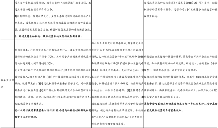 2) 募集资金用途上,科技型企业发行的科技创新债券,在符合相关法律法规和国家政策的基础上,可用于企业生产经营活动,如科技创新领域的项目建设、研发投入、并购重组(含参股型)、偿还有息负债、补充营运资金等用途;股权投资机构发行的科技创新债券,应至少50%的募集资金通过基金出资、股权投资等方式投资于科技型企业或主业聚焦于高技术制造业、高技术服务业、战略性新兴产业、知识产权(专利)密集型产业等领域的相关企业。