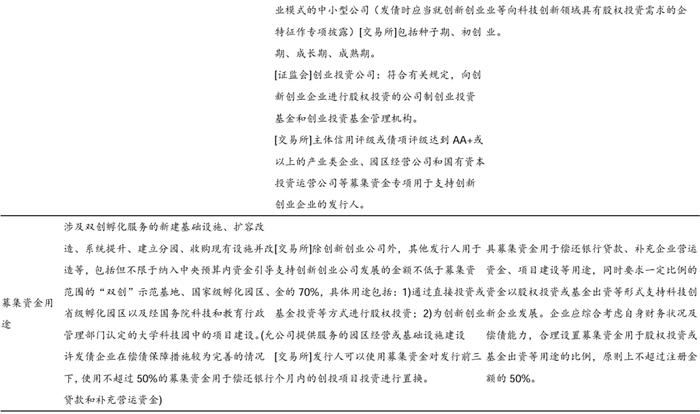 2) 募集资金用途上,除科创企业类外,其他类型发行人募集资金投向科技创新领域的比例不低于70%,其中用于产业园区或孵化基础设施相关用途的比例不得超过30%。