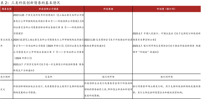 结合当前最新的科技创新债券内涵,2022年5月起经历了业务指引修订、债券品种与发行人内涵、政策支持等多方面完善,至今形成了以科创公司债(交易所)、科创票据(银行间)与科创债(银行间)为主要债券品种,以金融机构、科技型企业、股权投资机构为主要发行人,配套风险分散分担机制、一级市场发行便利与二级市场活跃度提振等多项政策支持措施的科技创新债券市场,为推动债市“科技板”建设起到关键作用。后文1.2节将从存量、一级发行与二级成交三个角度观察科技创新债券市场的发展现状,第二章将根据5月7日中国人民银行 中国证监会公告〔2025〕第8号的相关内容分析一系列配套支持机制及当前的发展情况。