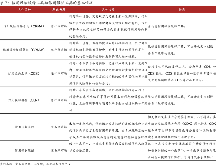 银行间市场的信用风险缓释工具(CRM)与交易所市场的信用保护工具。目前创设的信用风险分担工具主要包括银行间市场的信用风险缓释合约(CRMA)、信用风险缓释凭证(CRMW)、信用违约互换(CDS)、信用联结票据(CLN);交易所市场的信用保护合约和信用保护凭证。其中二级市场可交易品种的活跃度仍有较大提升空间。