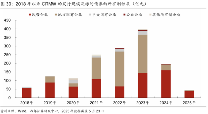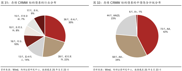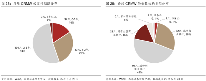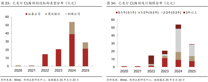 银行间市场方面,信用风险缓释合约与凭证主要由买方支付费用、卖方就约定标的债务提供信用风险保护,CRMA可根据双方需求定制合约条款,CRMW标准化程度较高、可在二级市场交易[3]。截至2025年5月23日,CRMW多由商业银行发行,期限较多集中在2-3年;其标的债券多为民营企业,行业主要分布在房地产、建筑装饰等(民营企业债券融资支持工具的重要体现),标的主体隐含评级通常较低。CLN多由证券公司发行,期限较多集中在2-3年。