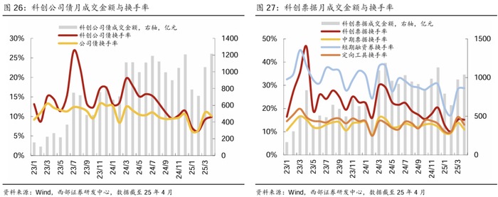 科创票据(银行间):二级市场估值收益率看短久期高资质的科创票据多数低于同类型债券(中票+短融+超短融+定向工具+交易商协会ABN),中短久期偏低资质的科创票据如0-1年(含1年)隐含评级AA及以下、3-4年(含4年)隐含评级AA-、4-5年(含5年)隐含评级AA-的相关科创票据的估值收益率明显高于同类型债券。月成交金额看科创票据23年全年中枢为522亿元、24年1月至25年4月中枢上升至915亿元;换手率同样有所下降,由23年均值26%下降至24年1月以来的19%。