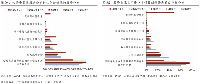 观察科技创新债券的不同募集用途,可以发现:1)用途提及“偿还有息债务置换用于偿还有息债务的资金”的在2022-2025年(1-4月)内的债券发行额与数量占比均超过半数,25年5月以来数量与规模占比均明显下降;2)用途提及“补充流动资金”、“基金投资或置换出资”、“股权投资或置换出资”的在25年5月的发行额与数量占比均明显上升。