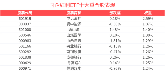 数据显示,截至2025年4月30日,中证国有企业红利指数(000824)前十大权重股分别为中远海控(601919)、冀中能源(000937)、渝农商行(601077)、上海银行(601229)、成都银行(601838)、山煤国际(600546)、粤高速A(000429)、中国神华(601088)、山西焦煤(000983)、沪农商行(601825),前十大权重股合计占比15.18%。