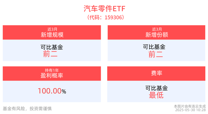 份额方面,汽车零件ETF近3月份额增长600.00万份,实现显著增长,新增份额位居可比基金2/4。