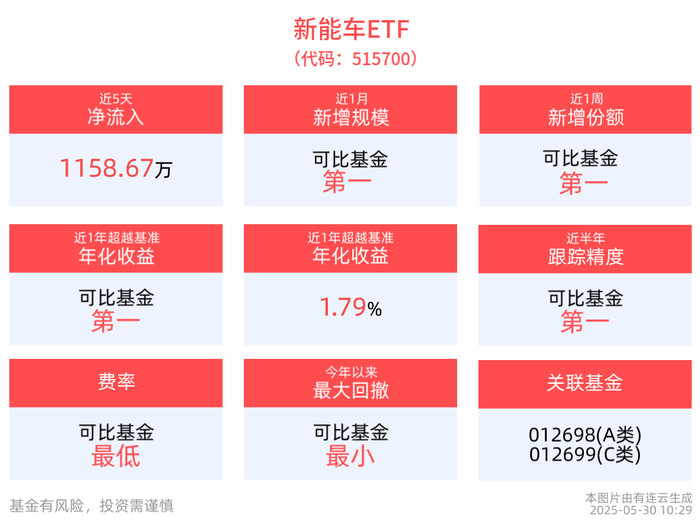 规模方面,新能车ETF近1月规模增长1623.39万元,实现显著增长,新增规模位居可比基金1/2。