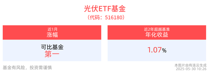截至2025年5月30日 10:26,中证光伏产业指数(931151)下跌1.22%。成分股方面涨跌互现,南网能源(003035)领涨9.98%,罗博特科(300757)上涨0.90%,固德威(688390)上涨0.71%;通威股份(600438)领跌3.00%,科华数据(002335)下跌2.92%,露笑科技(002617)下跌2.75%。光伏ETF基金(516180)下跌1.31%,最新报价0.53元。拉长时间看,截至2025年5月29日,光伏ETF基金近1月累计上涨1.33%,涨幅排名可比基金1/10。