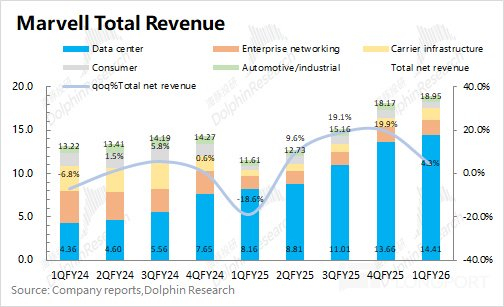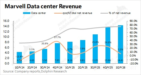 迈威尔科技 Marvell 在 2026 财年第一季度的数据中心业务实现营收 14.4 亿美元,环比增长 5.5%,符合市场预期(14.4 亿美元)。公司数据中心业务本季度的增长主要来自于 AI 业务的带动,主要是定制 ASIC 和光模块 DSP 芯片等方面。