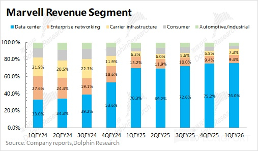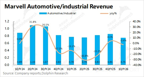 3)迈威尔科技 Marvell 在 2026 财年第一季度的汽车/工业业务实现营收 0.76 亿美元,同比下滑 2.4%。公司汽车/工业业务,主要涵盖自动驾驶、车载娱乐系统、工业机器人等领域,公司主要提供车载以太网等相关产品。尽管汽车终端市场的收入环比增长,但工业终端市场的下滑完全抵消了这一增长(工业领域的订单模式在任何季度都可能出现大幅波动)。