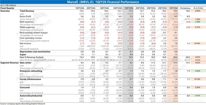 迈威尔科技 Marvell 在 2026 财年第一季度实现营收 19 亿美元,环比增长 4.3%,基本符合市场预期(18.8 亿美元)。由于市场主要关注 AI 业务给公司带来的成长性看点,因而环比角度会比同比更为直观。公司本季度营收端的增长,主要来自于数据中心及 AI 业务和运营商基础设施业务的带动。