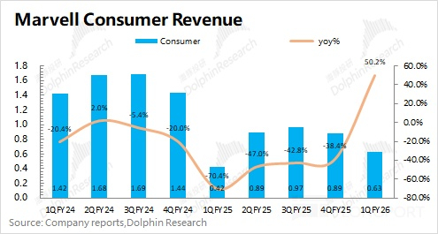 2)迈威尔科技 Marvell 在 2026 财年第一季度的消费电子业务实现营收 0.63 亿美元,同比增长 50%。公司消费电子业务,主要包括存储控制器、WiFi 芯片等产品,主要受季节性因素和游戏需求的影响。