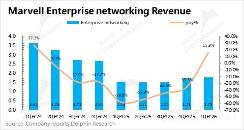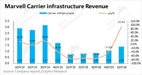 1)迈威尔科技 Marvell 在 2026 财年第一季度的企业网络业务和运营商基建业务分别实现营收 1.78 亿美元和 1.38 亿美元。两项业务本季度环比都有所回暖,反映出公司及园区的网络产品需求、运营商的光通信芯片和 5G 基站芯片等相关需求持续复苏。