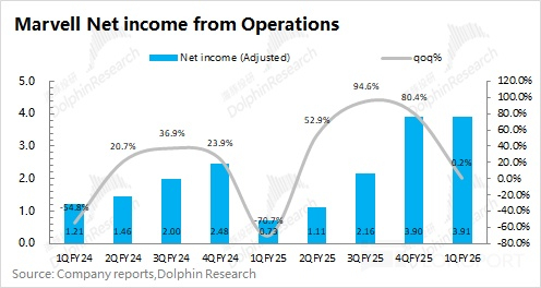 迈威尔科技 Marvell 在 2026 财年第一季度实现净利润 1.8 亿美元。公司调整后的毛利率都在 60% 附近,但公司财报的净利润却在此前较长时间都是亏损的状态,这主要是受收购摊销、重组费用以及其他因素影响。