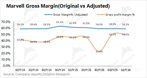 由于公司毛利率受收购资产摊销等方面的影响,因而财报中的毛利率并不能直接体现出经营情况。在剔除该影响后,海豚君参考调整后的毛利率看,公司本季度调整后的毛利率为 59.2%。公司毛利率整体呈现趋势性下行的情况,主要是因为定制 ASIC 相关业务的毛利率较低,随着业务占比提升,会结构性拉低公司整体毛利率。