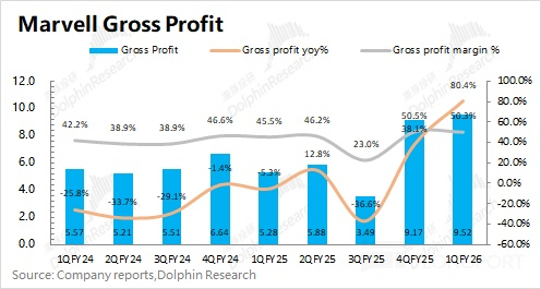 迈威尔科技 Marvell 在 2026 财年第一季度实现毛利 9.5 亿美元,同比增加 80%。其中 Marvell 在本季度的毛利率为 50.3%。