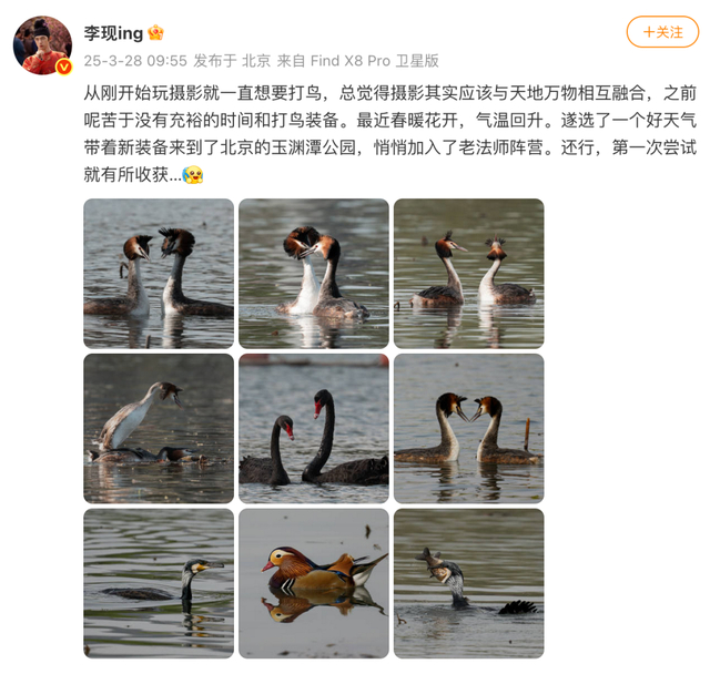 4月4日,@生态环境部 还专门发文:喜欢摄影的当红演员李现,果然不负“花鸟使”之名,以一己之力带火了#玉渊潭打鸟”#在内的N个话题,成为这个春季破圈的现象级讨论。