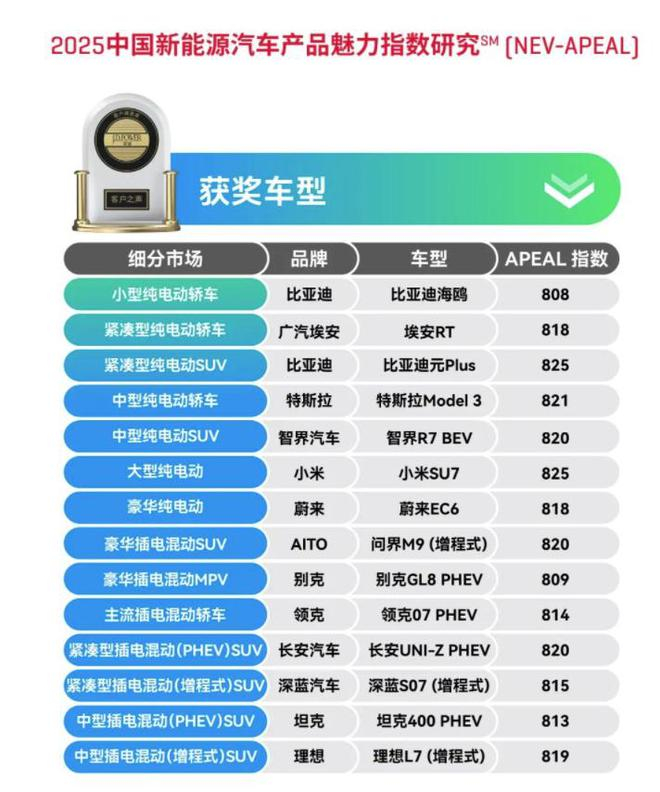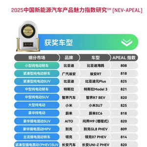 据悉,2025年的研究围绕新车的各个方面,来衡量车主对新能源汽车产品魅力的感受与满意程度,涉及11个车辆表现类别(外观造型、设置和启动、上/下车、车身内装、车辆性能、驾驶感受、安全感、车载信息娱乐系统、驾乘舒适性、燃油经济性和续航里程以及充电体验)的45个要素。同时,基于2024年7月至2025年1月之间购车的21,211位车主的真实反馈,研究覆盖48个品牌的122款车型,数据收集工作则于2025年1月至2025年3月间在81个主要城市进行。最终,比亚迪海鸥、特斯拉Model 3、小米SU7等车型,分别夺得小型纯电动轿车、中型纯电动轿车、大型纯电动等细分市场的第一名。