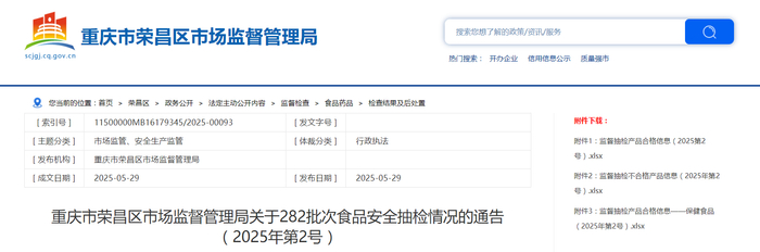 重庆市荣昌区市场监督管理局关于282批次食品安全抽检情况的通告(2025年第2号)