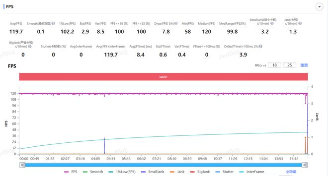 在进行游戏测试时,小编将平板调节到性能模式,首先是《王者荣耀》,在小米平板 7 Ultra 上已经支持 120 帧模式,测试时将画质选项调到最高,进行一句大概 15 分钟的对战,测得游戏运行的平均帧率为 119.7 FPS,从帧率曲线上来看整个过程很平稳,基本上就是一条直线。