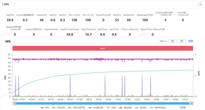 结束时,测得小米平板 7 Ultra 运行《原神》平均帧率为 59.8 FPS,看帧率曲线也十分平稳,游玩过程很流畅,基本没感到有明显的掉帧卡顿。