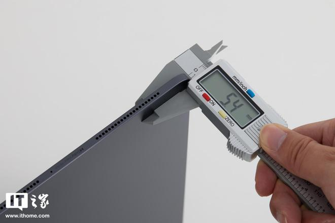 机身采用一体化的直角中框,以非常细微的曲线进行过渡,中框很窄,机身很薄,IT之家实测整机厚度只有 5.4mm,重量则仅为 622g。