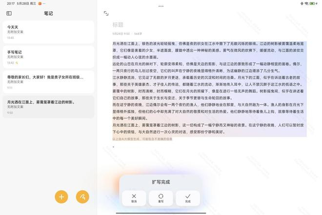 比如小编在小米平板 7 Ultra 柔光版自带的笔记应用中使用 AI 写作能力让它帮我写一段家长会的开场白,它很快就写了出来,而且是基本改改开头就能直接用的。