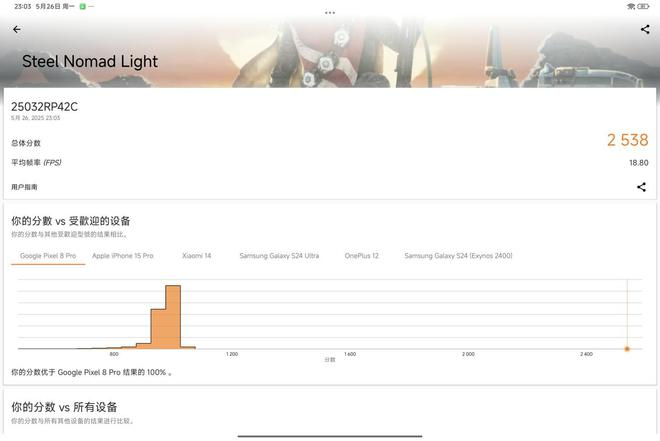 同时IT之家还用 3D Mark 中代表移动端图形能力的 Steel Nomad Light 项目进行测试,得到总体分数为 2538 分,平均帧率 18.80 FPS。