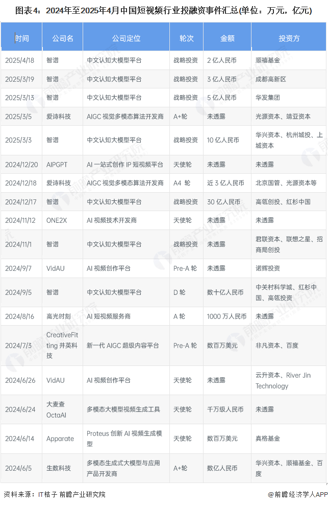 从具体投融资事件上看,2024年至2025年4月,近期AI短视频领域投资中,AI视频创作的单笔融资金额普遍较大,智谱外,爱诗科技、生数科技是行业主要获投企业,主要投融资事件如下所示: